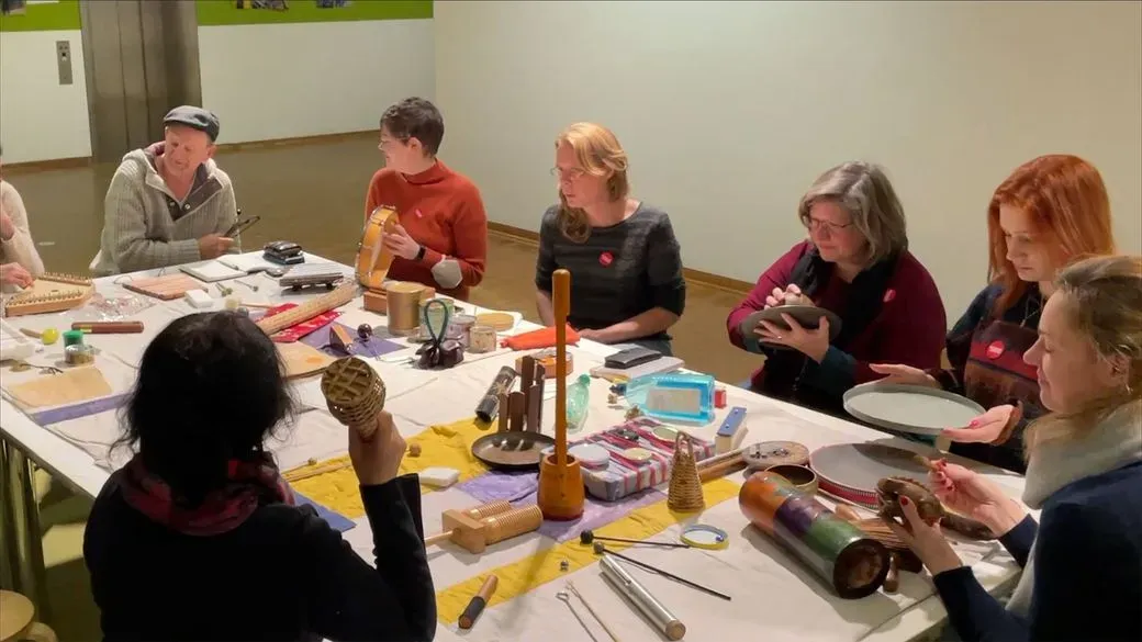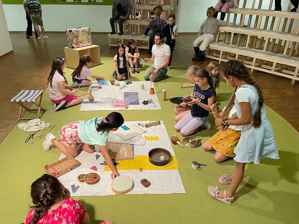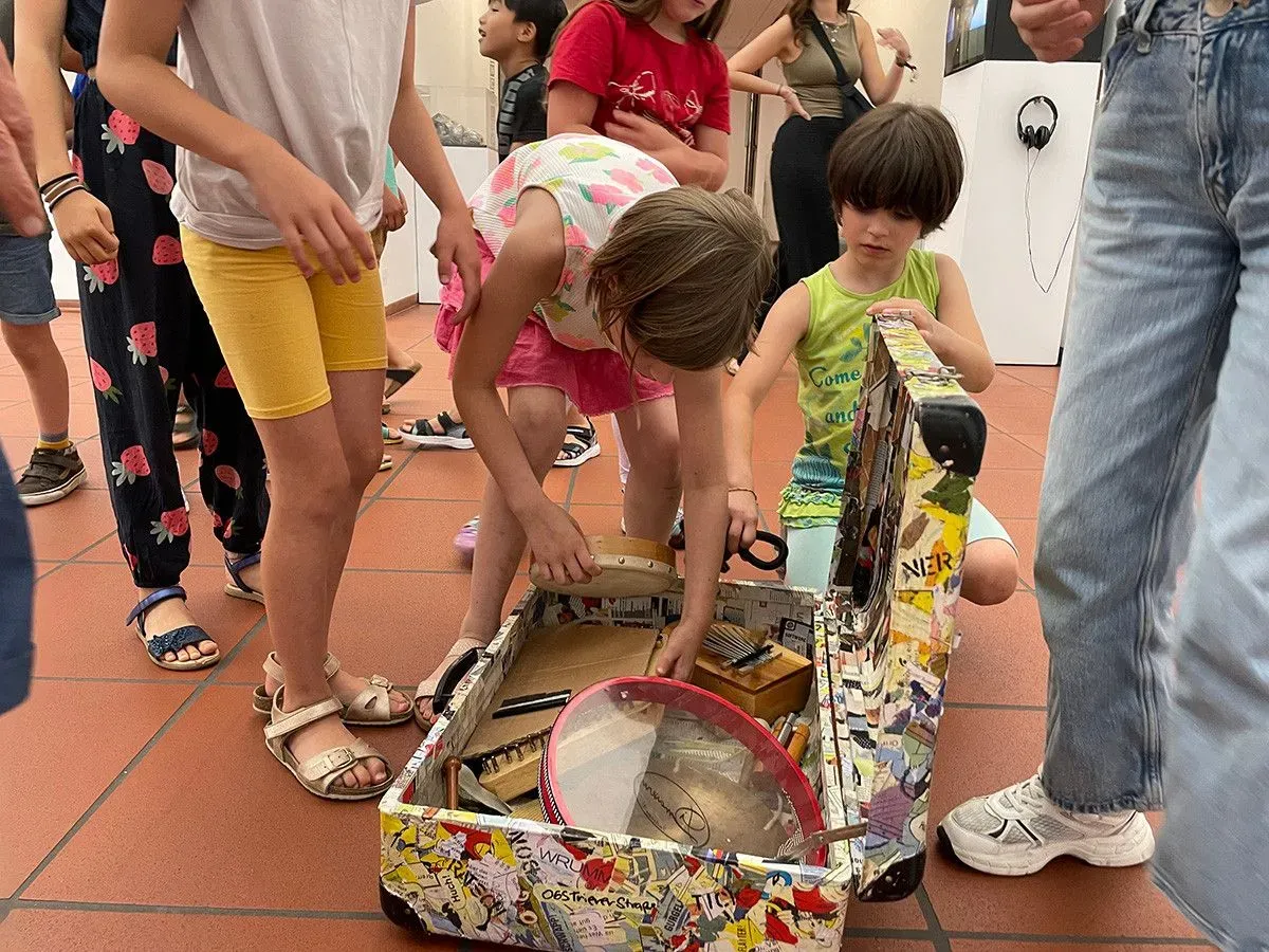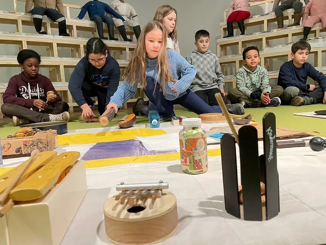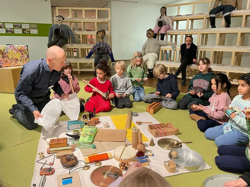 Während des Museumsbesuchs reise ich mit ihnen mit einem Klangkoffer voller Instrumente in die Welt der Sounds. Was klingt rau, was glatt? Wie klingt ein Punkt, wie eine Fläche, wie klingen Farben?