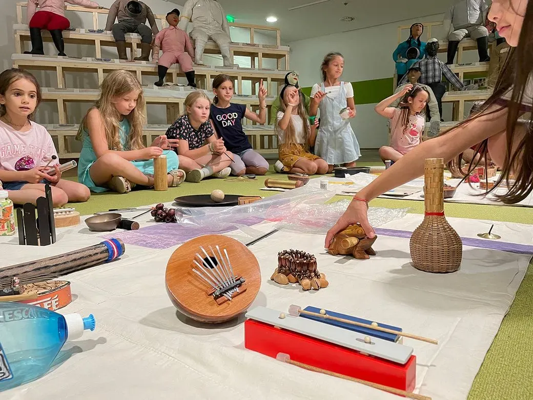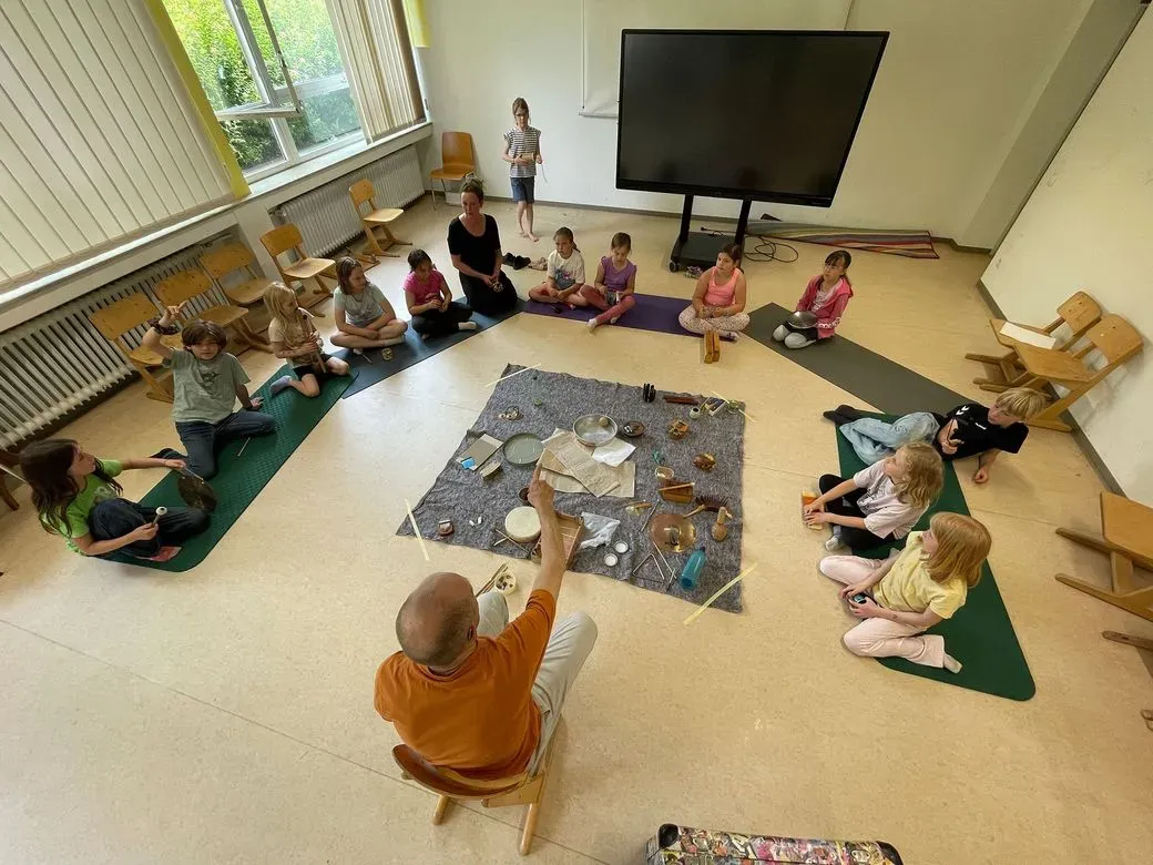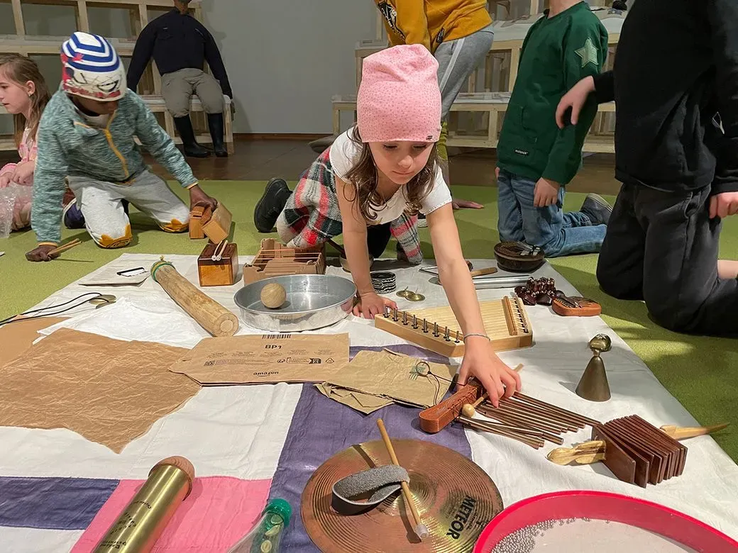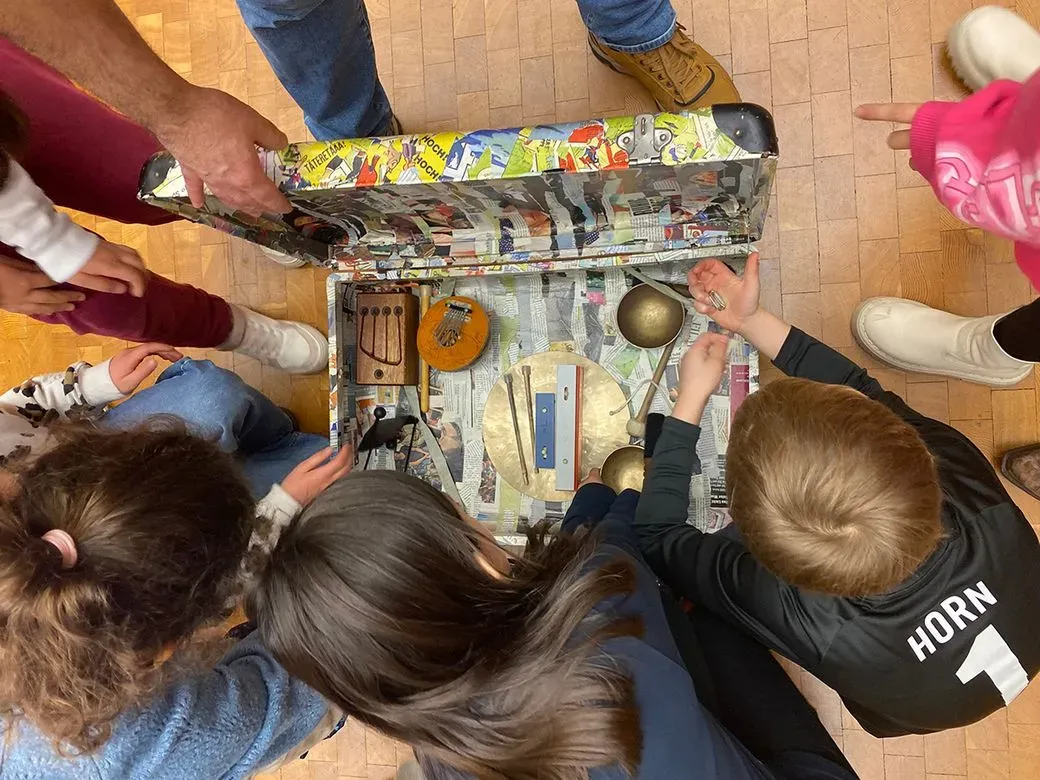 Die Kinder erforschen mit meinem Klangkoffer die Welt der Klänge, lernen dirigieren und spielen zum Abschluss als "Horchester" vor einem Kunstwerk ein Konzert.
